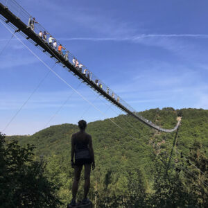 Next stop is about 230 km further, in Germany: the Geierlay bridge. The longest suspension bridge for walkers in Europe, with 360 meters long and 100 meters high. We drive to Morsdorf. Once a sleepy village, but now bursting because of the bridge. The bridge itself is about 2 km from the village, all free. Except for the car park of course. They are all 1 euro per hour.