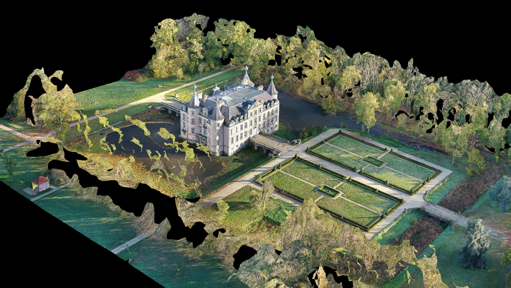 – Getting a 3D image from Poeke castle. This was made possible by pasting 910 high resolution photos together.There is even the possibility to send the 3D file to a 3D printer and print the model:
