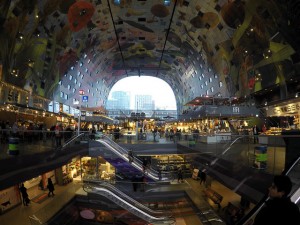 We changed our planning, and decided to go to the market first. This is not just an average covered market … The building opened in 2014 and is the first covered market of the Netherlands. But on top of it, it houses the biggest art work in the world: the Horn of Plenty. It is a huge piece of colorful drawings on the 24353376782_00d9ced356_zceiling, and actually best to be seen by night. The building is an arch which houses units, the hollow part is the market … Pretty amazing! The market hall is also built on the place where Rotterdam was ‘founded’ – De Rotte, in the 13th Century. About the only really old building is just meters away from here: the Laurens Church, or the ‘Big Church’. It was built around the 15th Century, and is still standing strong between all these architectural youngsters. Since the weather was still not clearing, we decided to have our lunch inside one of Holland’s most iconic shopping centers: ‘De Bijenkorf’.