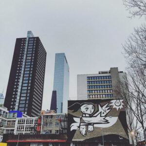 The first impression when we walked outside the station gave a pretty good impression of the rest of Rotterdam. Lot’s of high (from what height equals ‘high’ ‘skyscraper’?) and modern buildings, with open spaces in between. We headed to the ‘Luchtsingel’ first. It is a footbridge, but we stayed at the beginning of the bridge. Not because we were not curious to see where it goes, but because the weather decided to be a big disappointment for the rest of the morning … The area around the Luchtsingel was neglected for years, but a revaluation is going on, meaning alternative shops and alternative art. Just as we like it, but a thorough research will be for a warmer and dryer day.