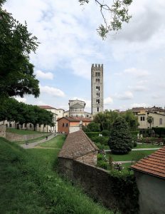 The most relaxed city of our trip was Lucca. And that’s mostly because we were able to take a bike to town. The inner town is only accessible by car for citizens, and that makes a great difference! The most remarkable monument is definitely the tower with the trees on top: the Torre Guinigi. The reason why there are trees on top? Because that makes the tower higher (see San Gimignano) than the actual highest tower – the Torre delle Ore. We buy a ticket to visit both (€ 6 per person). We’ve seen enough churches for sure, and Lucca has some more to offer. We really enjoy the city, and with our bikes we are able to see all the highlights in half a day, including the Piazza Anfiteatro. The square actually is an amphitheater, surrounded by houses and cafés. We go up the wall, which is nice to see Lucca from another perspective. And you don’t have to pay to have a look at the garden of Palazzo Pfanner! We found some nice places to eat as well: Soup in Town is the first vegetarian place we find, the pasta and risotto at Ghinkgo Tea was delicious and the gelato at Gelateria Veneto was lovely!